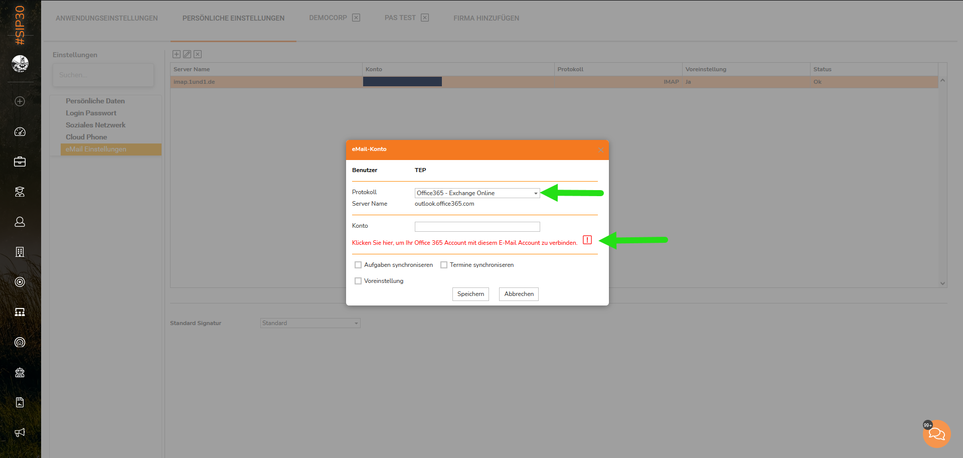 Zum Schluss taucht bei der ausgewählten Option ein kleiner, roter Text auf, auf den der User klicken muss. Er wird zur o365 Seite weitergeleitet und muss sich mit seinen Daten anmelden. Das Konto Feld wird automatisch ausgefüllt.