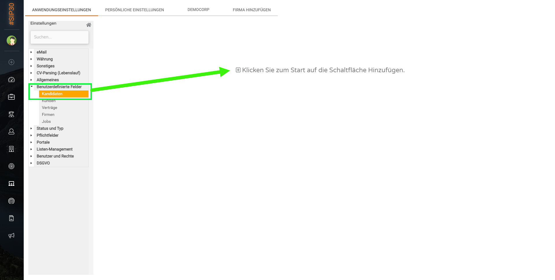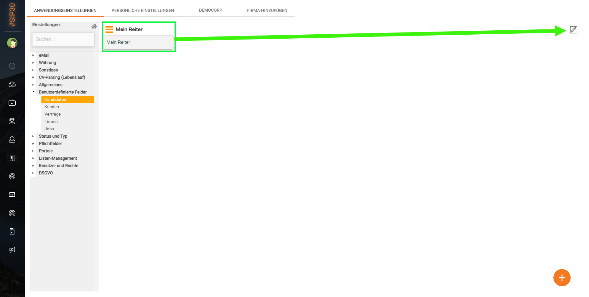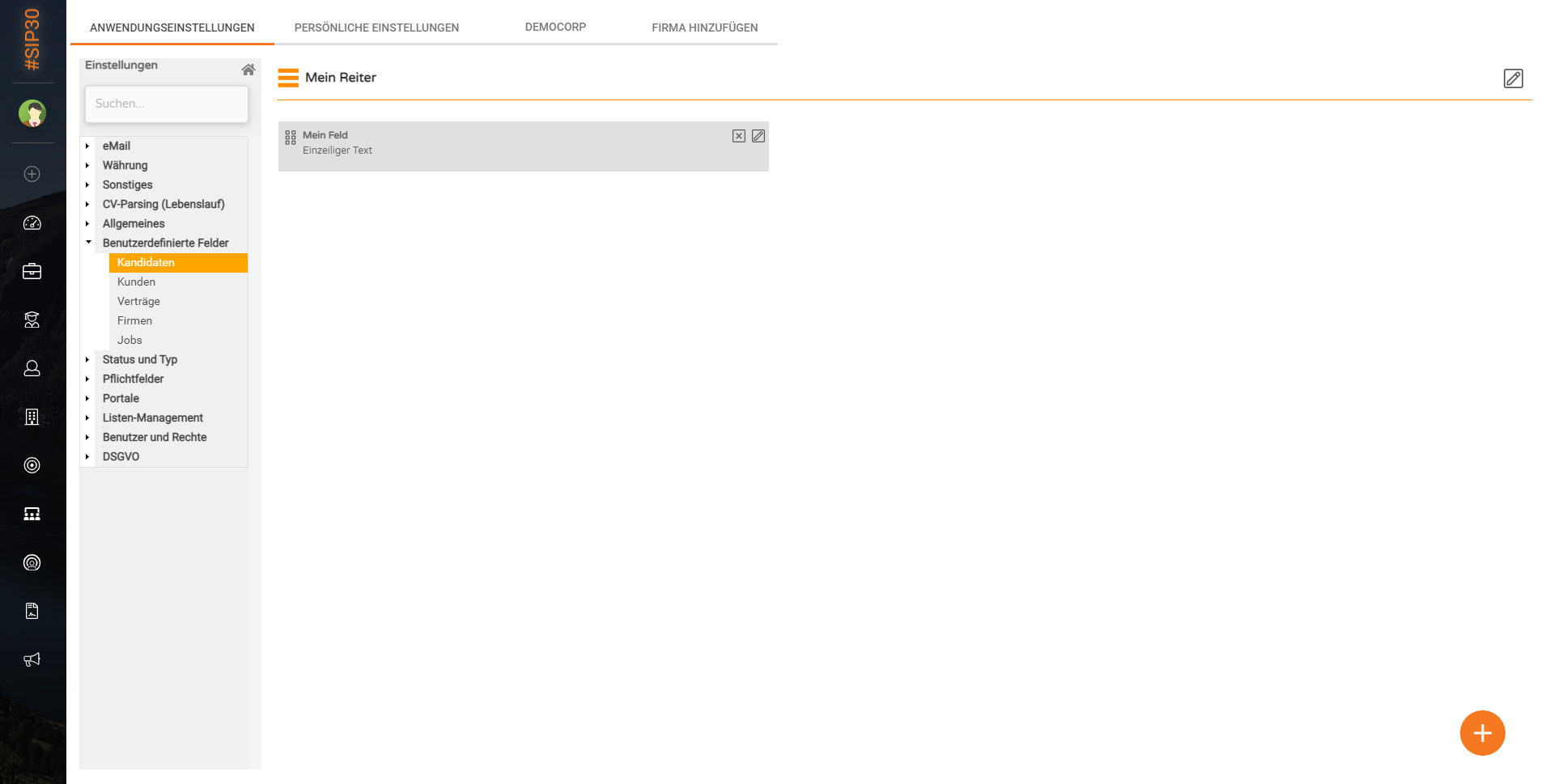 Um benutzerdefinierte Felder anzulegen, öffnen Sie die Einstellungen und navigieren Sie in die Anwendungseinstellungen. Wählen Sie das gewünschte Modul, für welches Sie ein benutzerdefiniertes Feld anlegen möchten, unter dem Oberbegriff Benutzerdefinierte Felder aus. Klicken Sie anschließend auf das "+", um einen neuen Reiter hinzuzufügen.